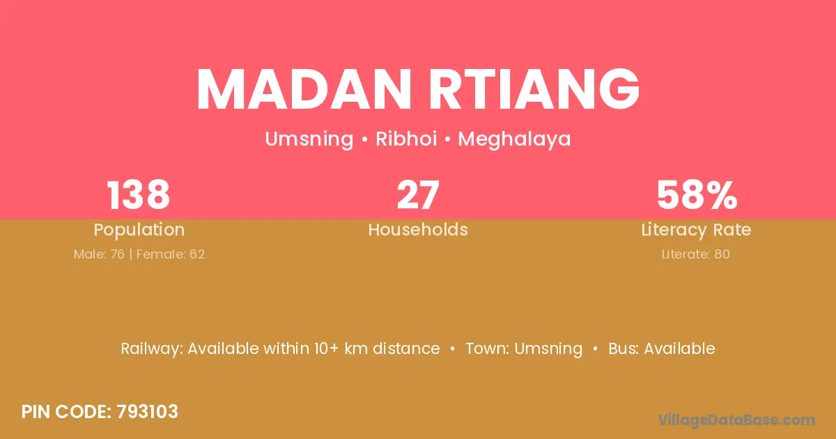 The literacy rate of Madan Rtiang village is 57.97%. Male literacy stands at 57.89% and female literacy at 58.06%.