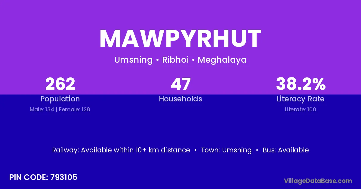 Mawpyrhut village has a total population of 262 people, of which 134 are males and 128 are females.