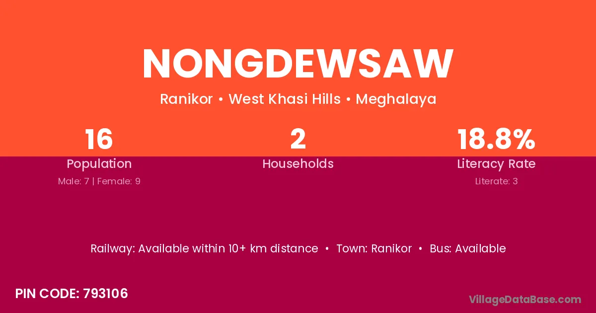 The literacy rate of Nongdewsaw village is 32.43%. Male literacy stands at 27.19% and female literacy at 37.96%.