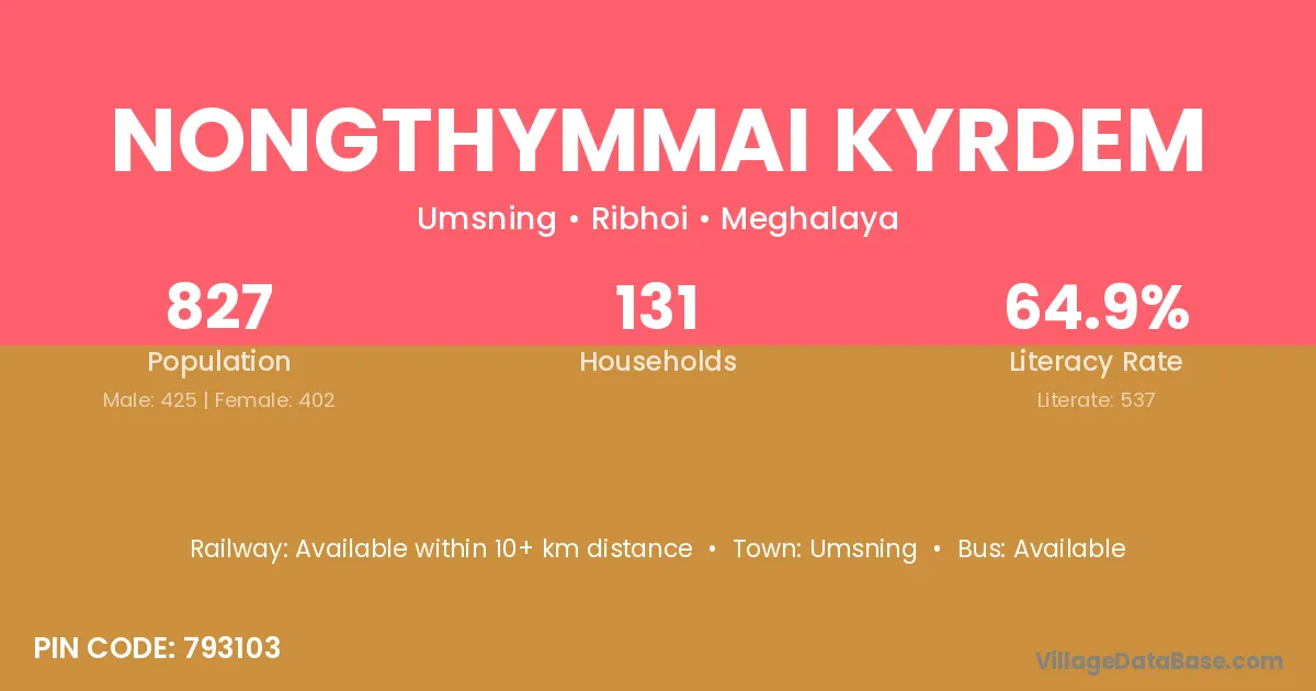 Nongthymmai Kyrdem village has a total population of 827 people, of which 425 are males and 402 are females.