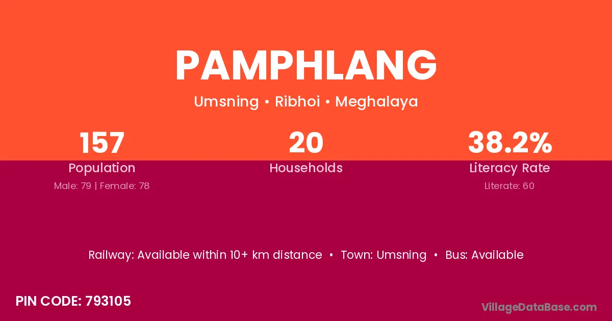 Pamphlang village has a total population of 157 people, of which 79 are males and 78 are females.