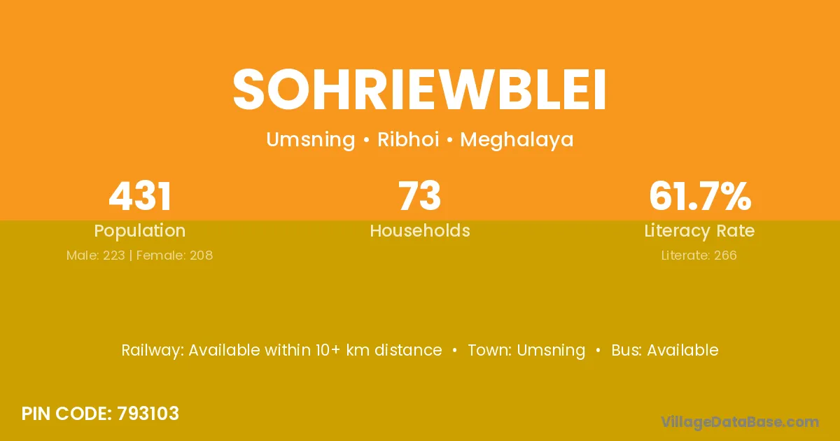 Sohriewblei village has a total population of 431 people, of which 223 are males and 208 are females.