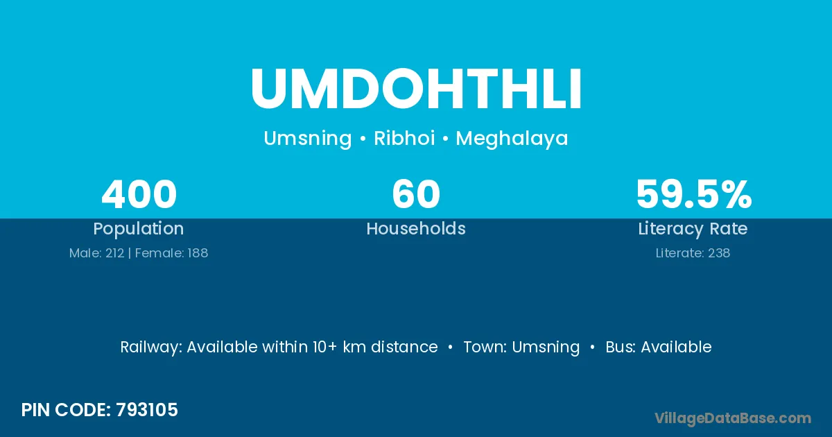 The literacy rate of Umdohthli village is 59.50%. Male literacy stands at 51.89% and female literacy at 68.09%.