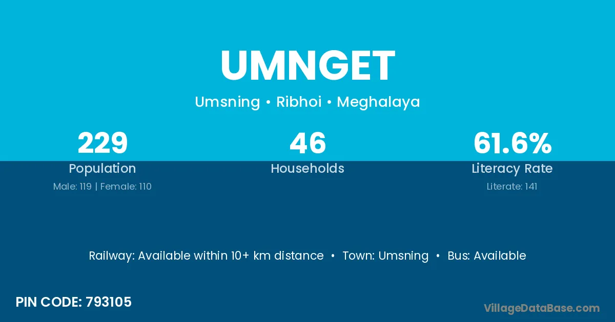 The literacy rate of Umnget village is 61.57%. Male literacy stands at 62.18% and female literacy at 60.91%.