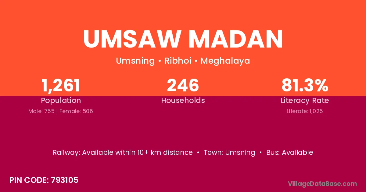 Umsaw Madan village has a total population of 1,261 people, of which 755 are males and 506 are females.