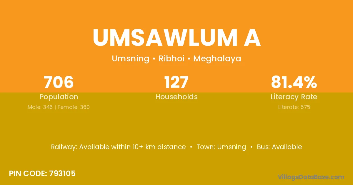 Umsawlum A village has a total population of 706 people, of which 346 are males and 360 are females.