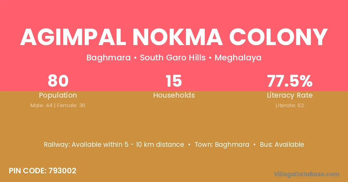 Agimpal Nokma Colony village has a total population of 80 people, of which 44 are males and 36 are females.