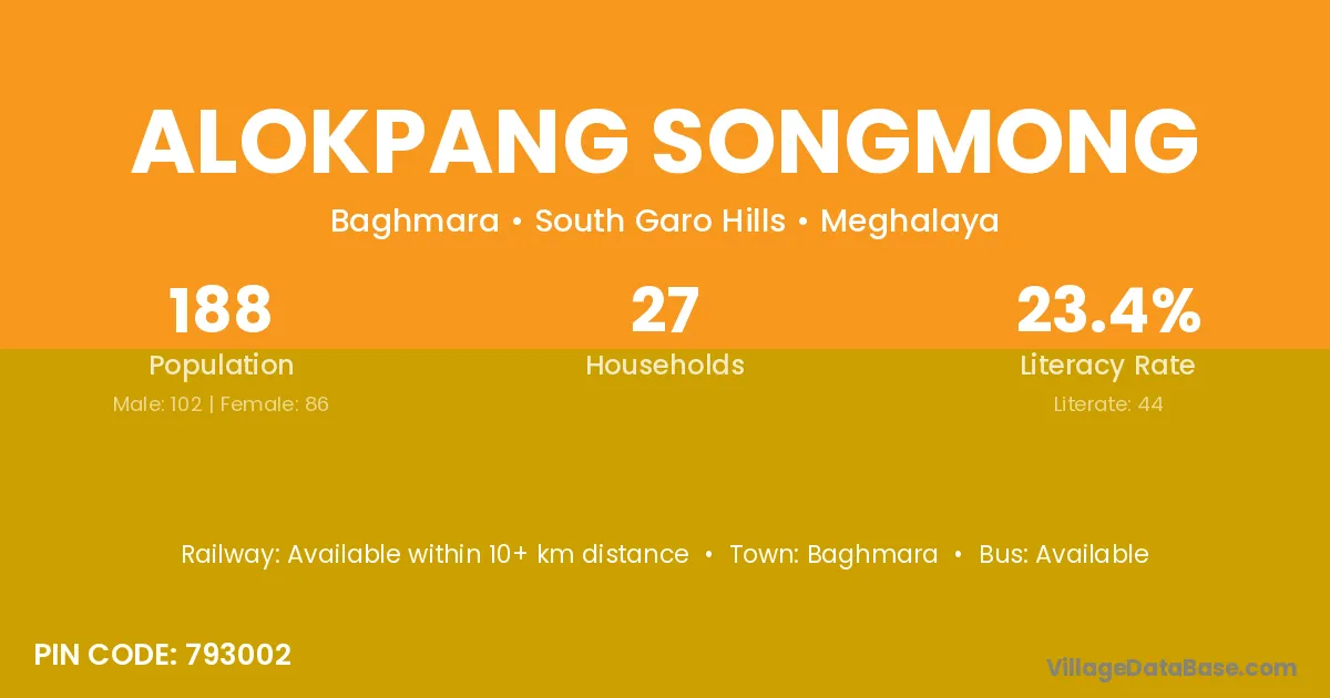 Alokpang Songmong village has a total population of 188 people, of which 102 are males and 86 are females.