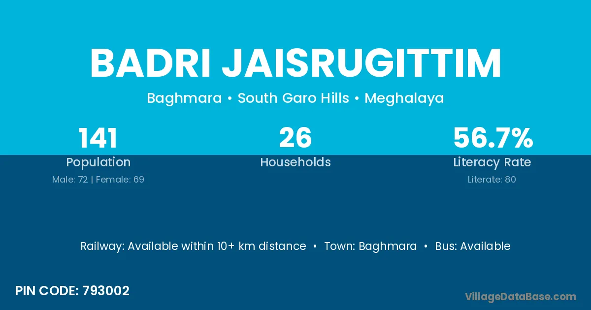 Badri Jaisrugittim village has a total population of 141 people, of which 72 are males and 69 are females.