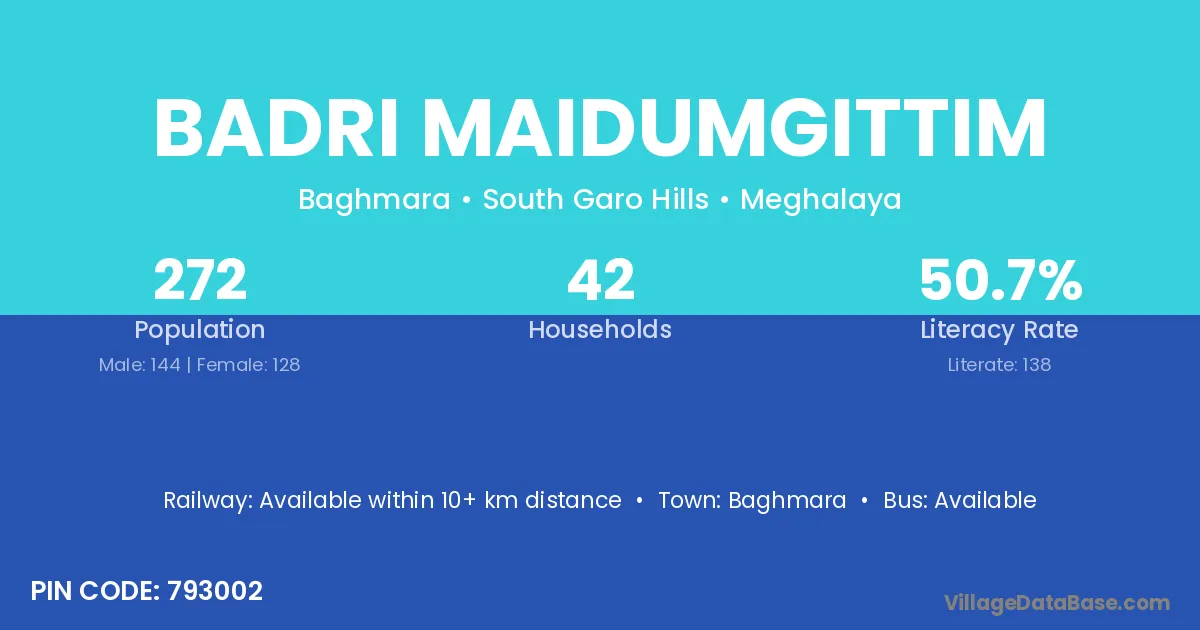 Badri Maidumgittim village has a total population of 272 people, of which 144 are males and 128 are females.
