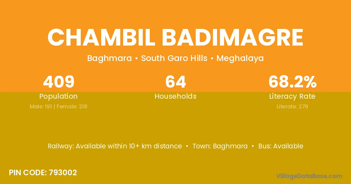 The literacy rate of Chambil Badimagre village is 68.22%. Male literacy stands at 70.68% and female literacy at 66.06%.