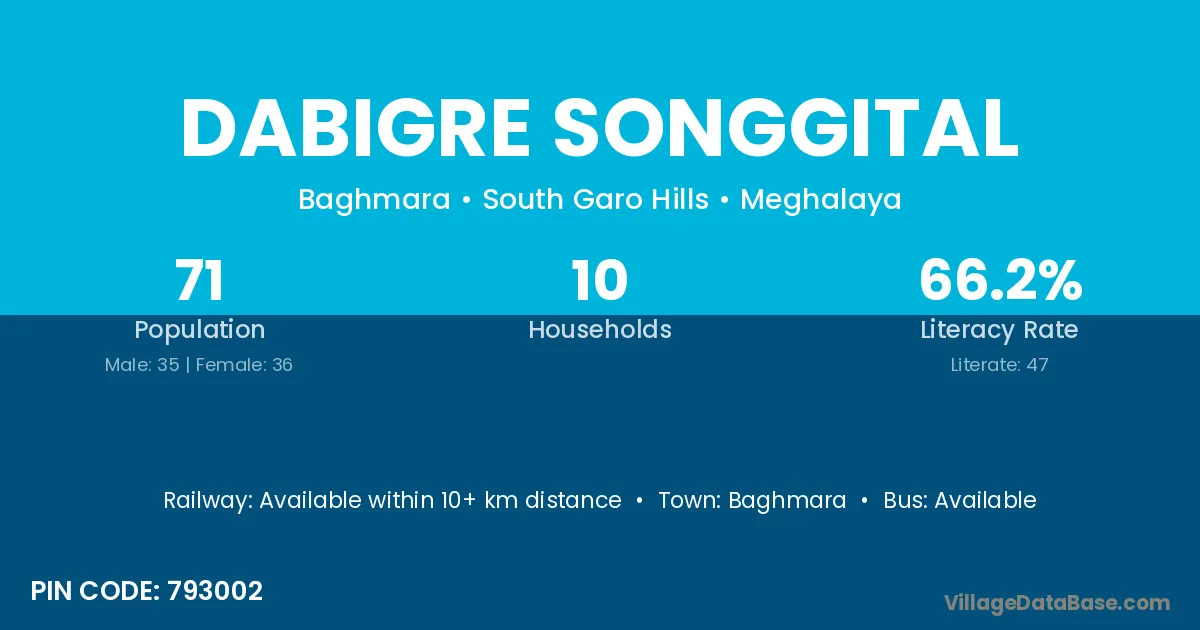 Dabigre Songgital village has a total population of 71 people, of which 35 are males and 36 are females.
