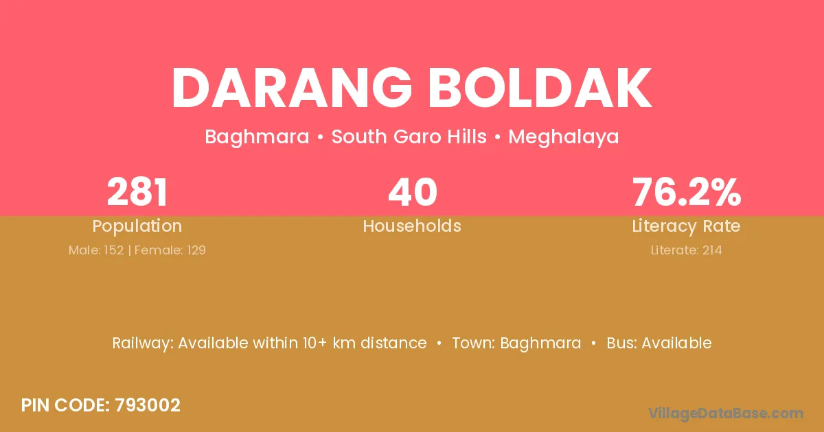 Darang Boldak village has a total population of 281 people, of which 152 are males and 129 are females.