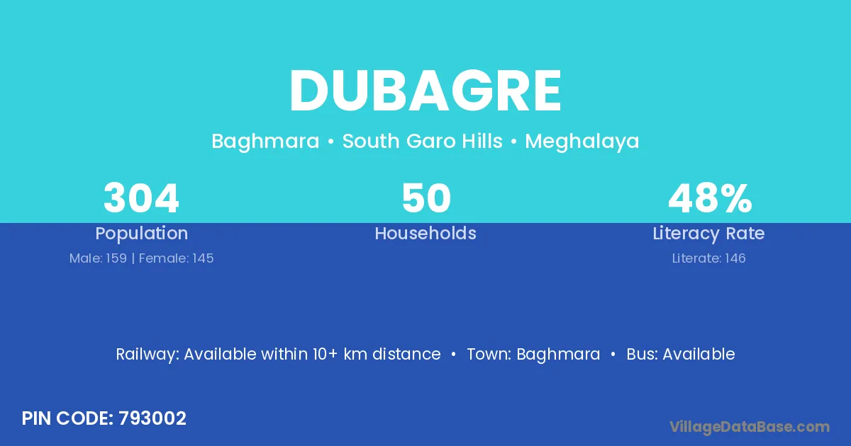 Dubagre village has a total population of 304 people, of which 159 are males and 145 are females.