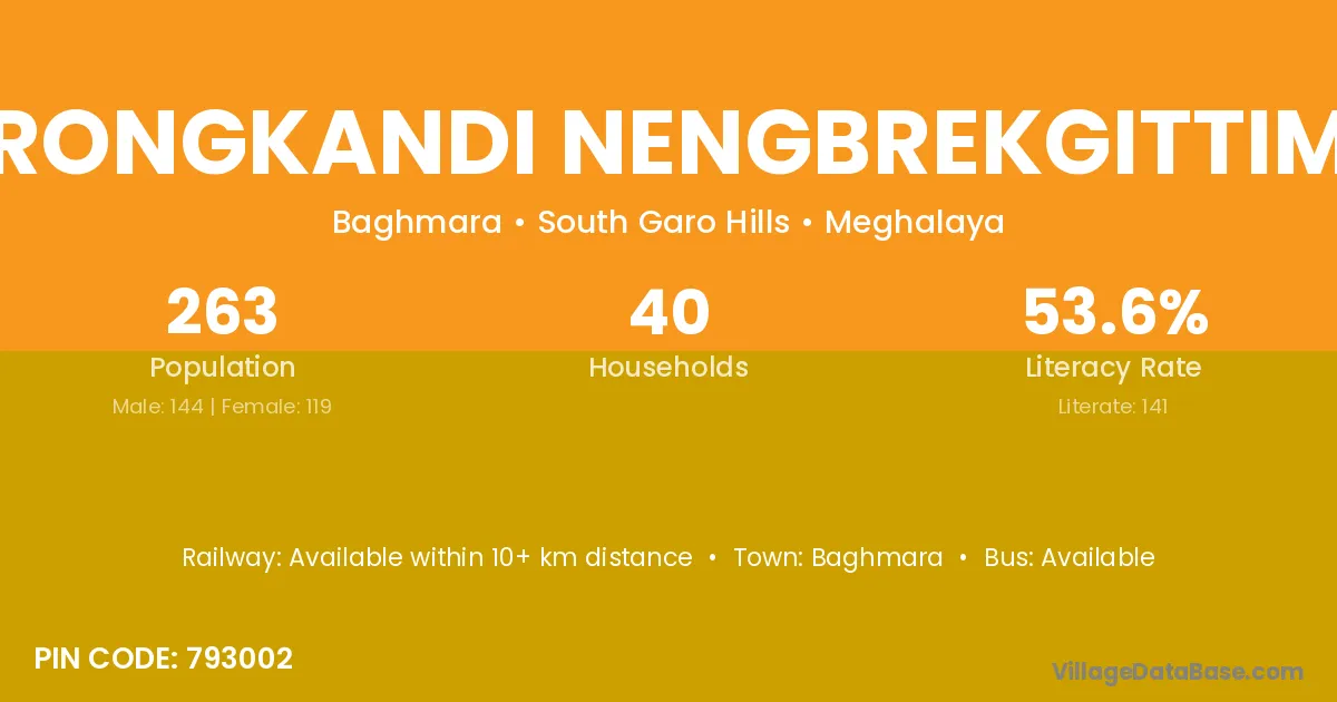 Rongkandi Nengbrekgittim village has a total population of 263 people, of which 144 are males and 119 are females.