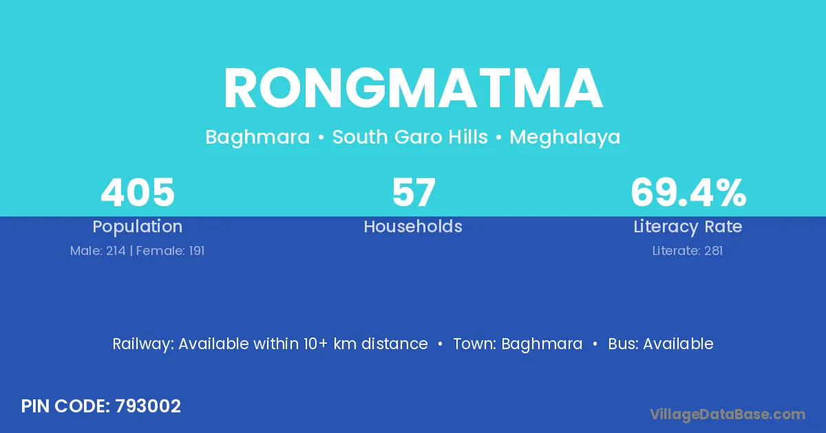 Rongmatma village has a total population of 405 people, of which 214 are males and 191 are females.