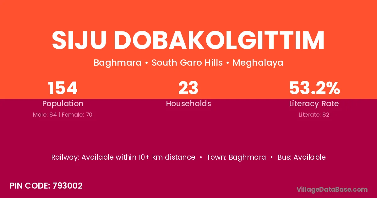 Siju Dobakolgittim village has a total population of 154 people, of which 84 are males and 70 are females.