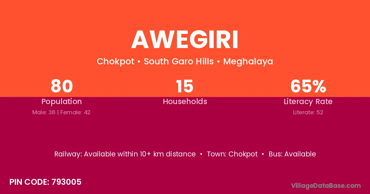 Awegiri village has a total population of 80 people, of which 38 are males and 42 are females.
