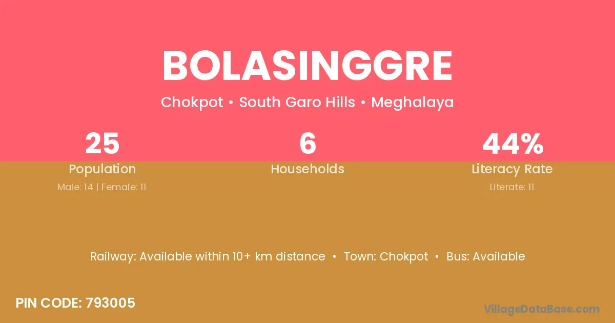 Bolasinggre village is located in the Chokpot Subdivision of the South Garo Hills district in Meghalaya .