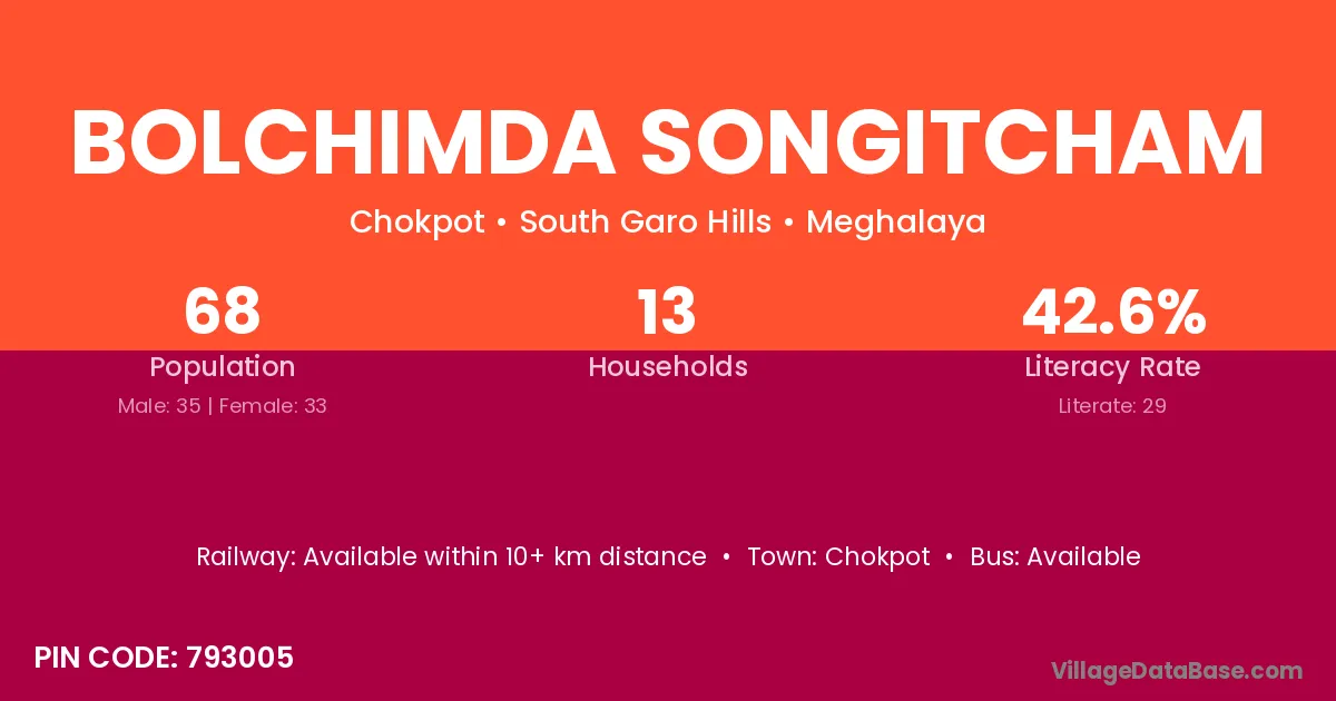 Bolchimda Songitcham village has a total population of 68 people, of which 35 are males and 33 are females.