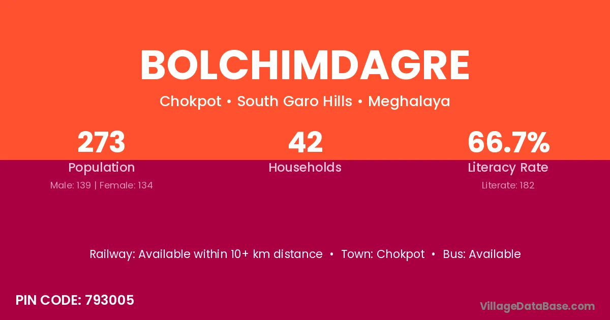 Bolchimdagre village has a total population of 273 people, of which 139 are males and 134 are females.