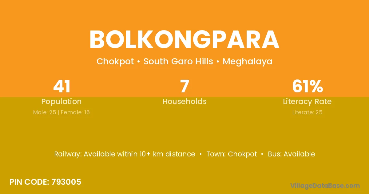 According to Census 2011 information, the village code of Bolkongpara village is 793005.