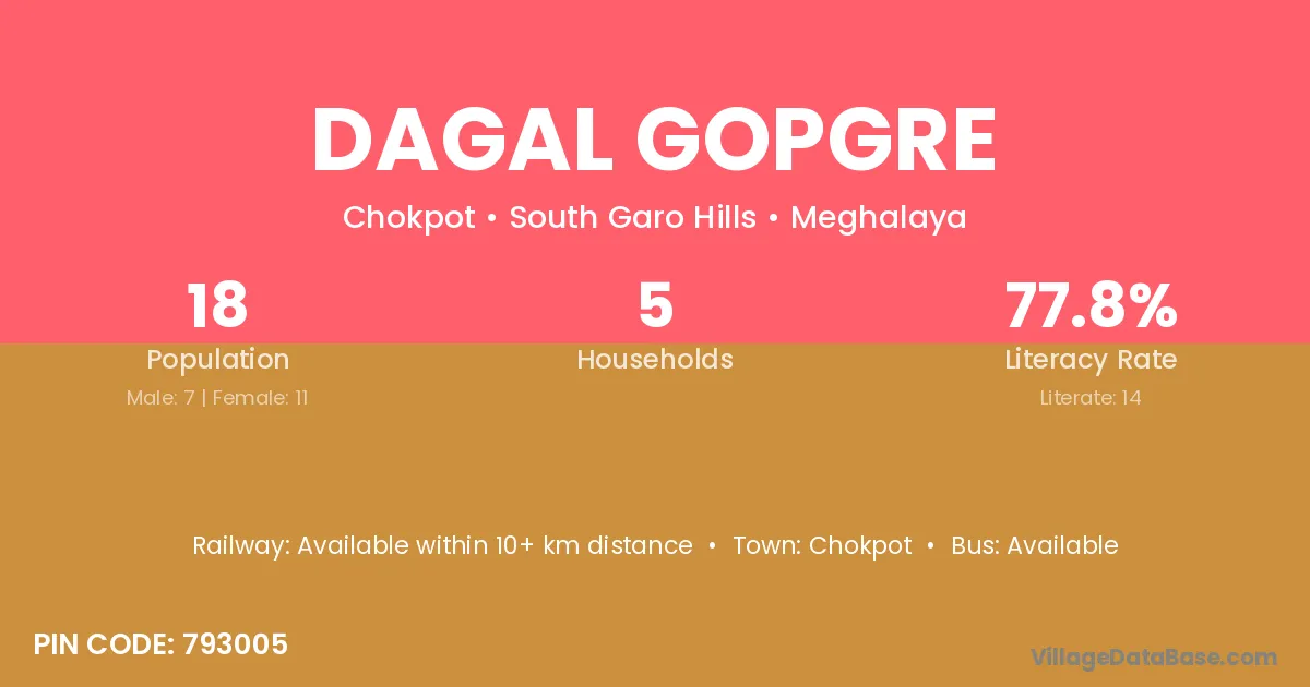 Dagal Gopgre village has a total population of 18 people, of which 7 are males and 11 are females.