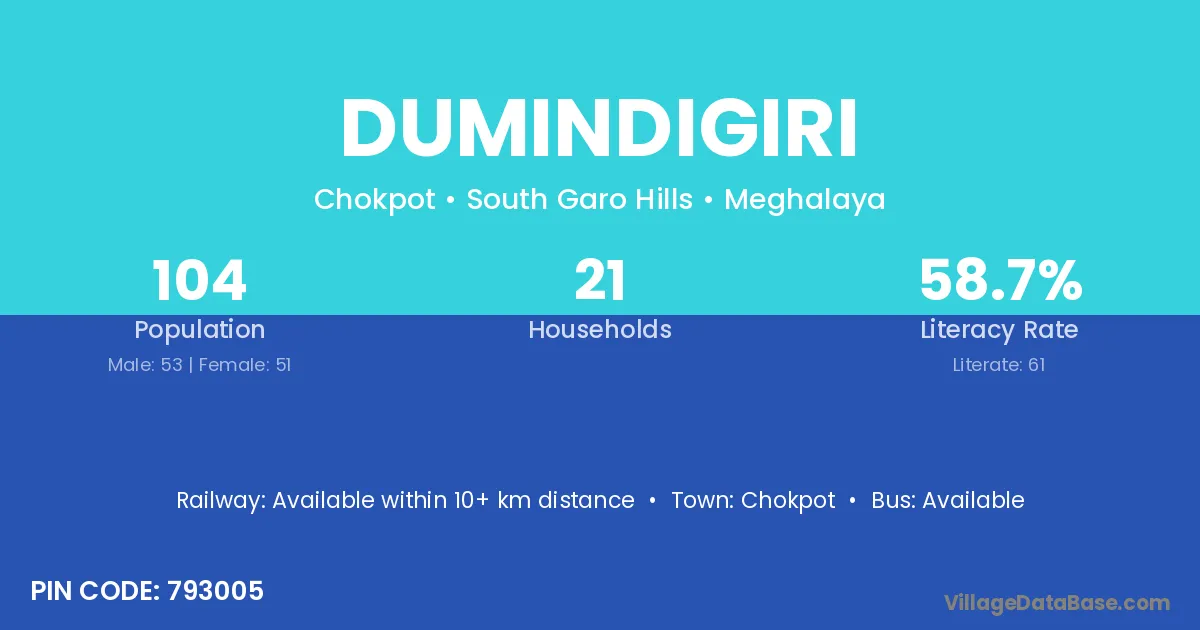 Dumindigiri village has a total population of 104 people, of which 53 are males and 51 are females.