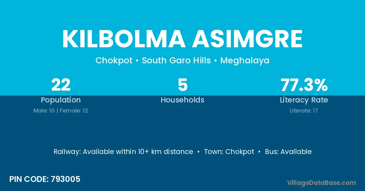 Kilbolma Asimgre village has a total population of 22 people, of which 10 are males and 12 are females.