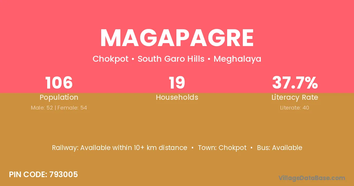 Magapagre village has a total population of 106 people, of which 52 are males and 54 are females.