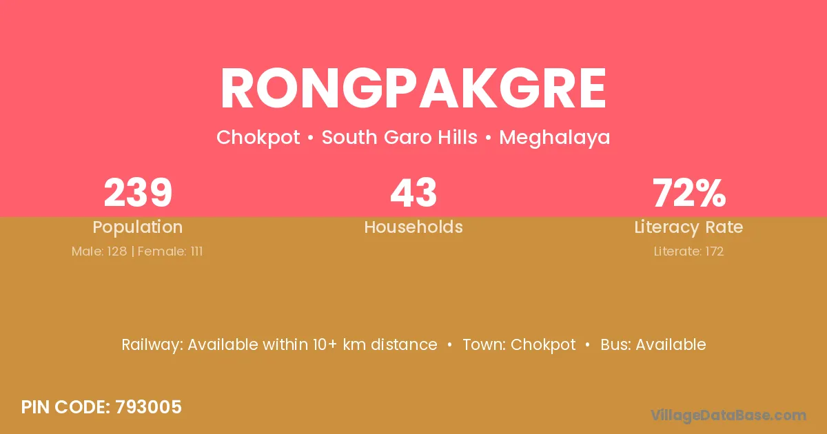 Rongpakgre village has a total population of 239 people, of which 128 are males and 111 are females.