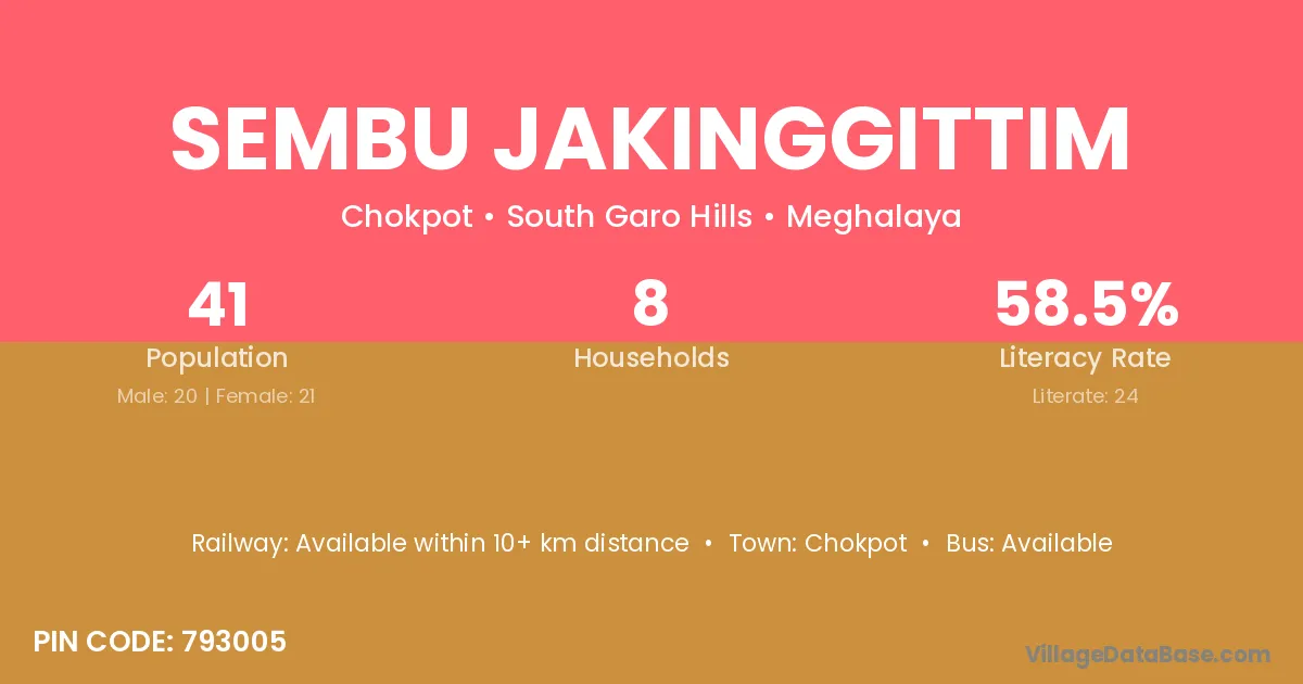 Sembu Jakinggittim village has a total population of 41 people, of which 20 are males and 21 are females.