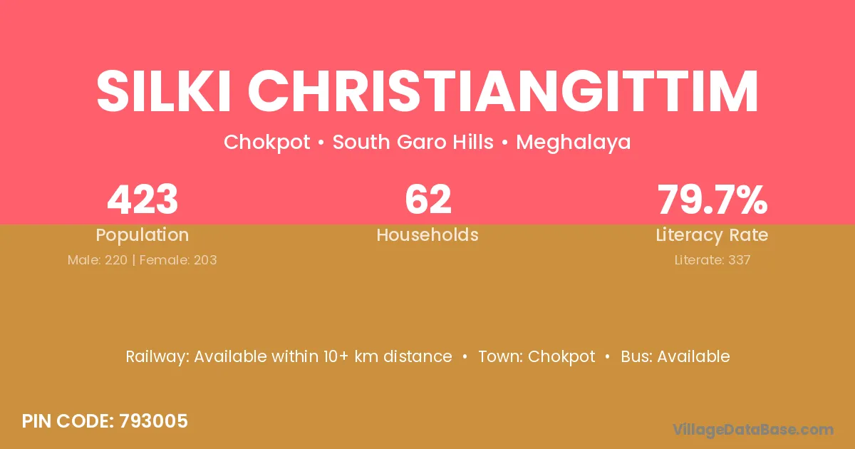 Silki Christiangittim village has a total population of 423 people, of which 220 are males and 203 are females.