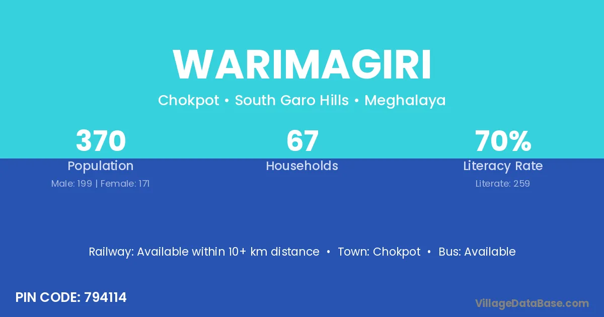 Warimagiri village has a total population of 370 people, of which 199 are males and 171 are females.
