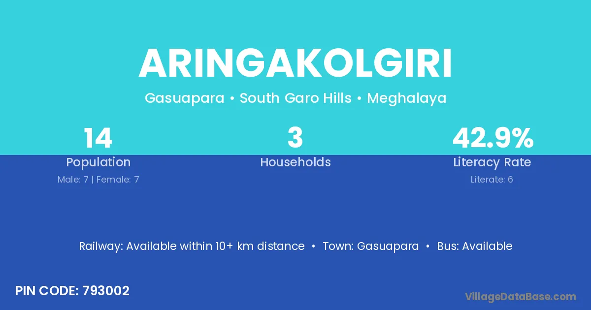Aringakolgiri village has a total population of 14 people, of which 7 are males and 7 are females.