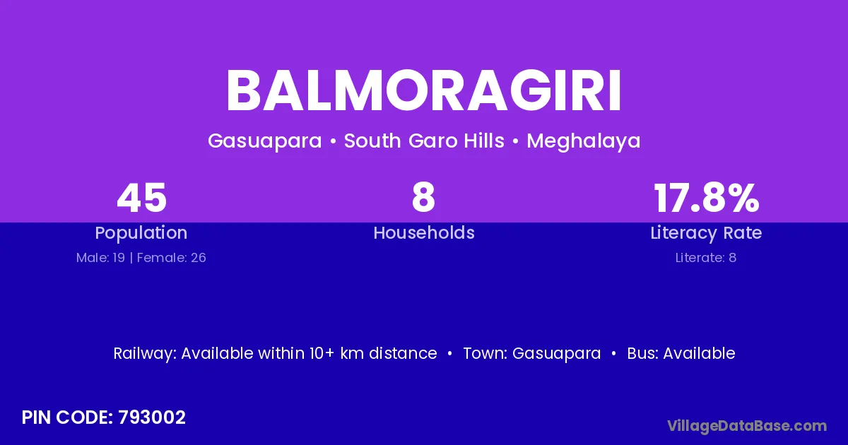 Balmoragiri village has a total population of 45 people, of which 19 are males and 26 are females.