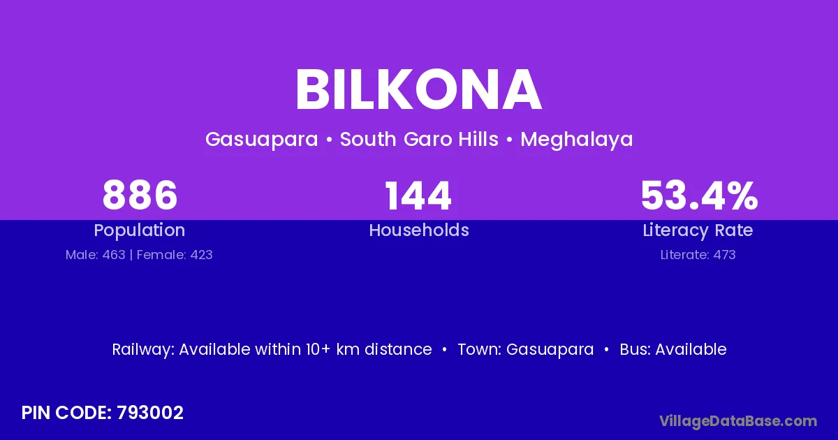 Bilkona village has a total population of 886 people, of which 463 are males and 423 are females.