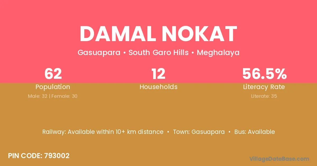 Damal Nokat village has a total population of 62 people, of which 32 are males and 30 are females.
