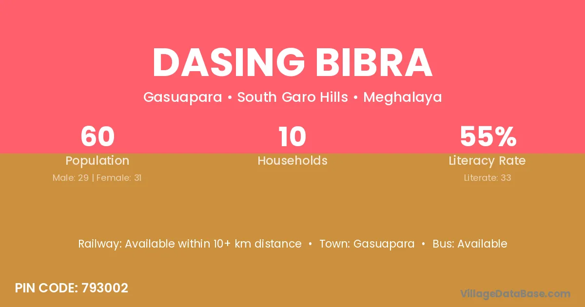 Dasing Bibra village has a total population of 60 people, of which 29 are males and 31 are females.