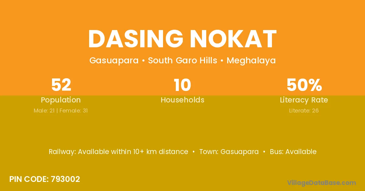Dasing Nokat village has a total population of 52 people, of which 21 are males and 31 are females.