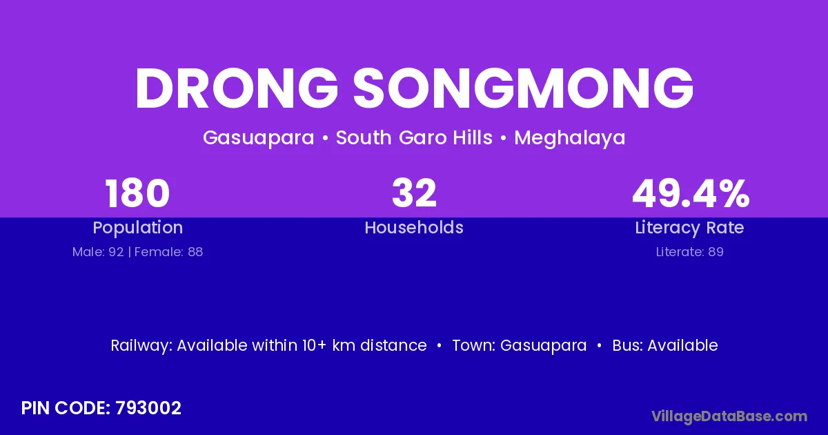 The literacy rate of Drong Songmong village is 49.44%. Male literacy stands at 58.70% and female literacy at 39.77%.