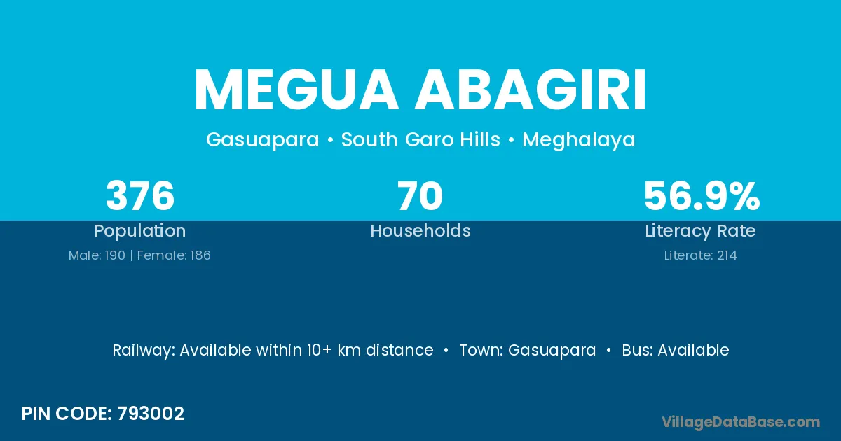 Megua Abagiri village has a total population of 376 people, of which 190 are males and 186 are females.