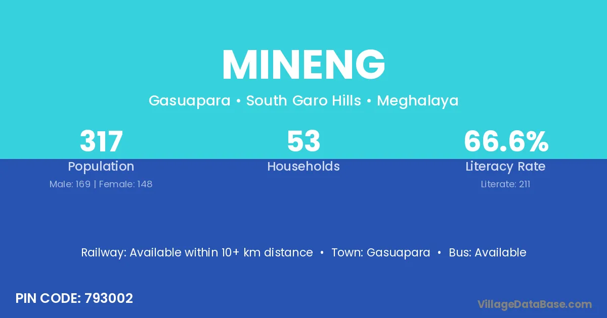 Mineng village has a total population of 317 people, of which 169 are males and 148 are females.