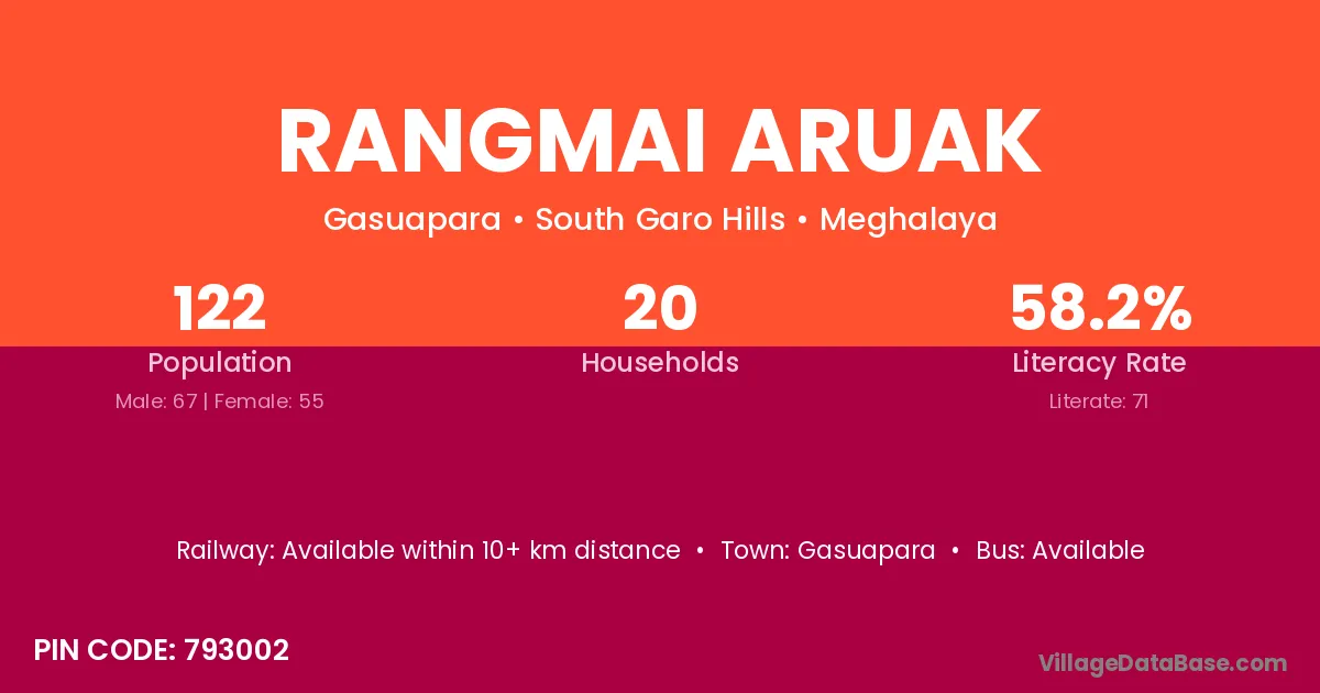 Rangmai Aruak village has a total population of 122 people, of which 67 are males and 55 are females.