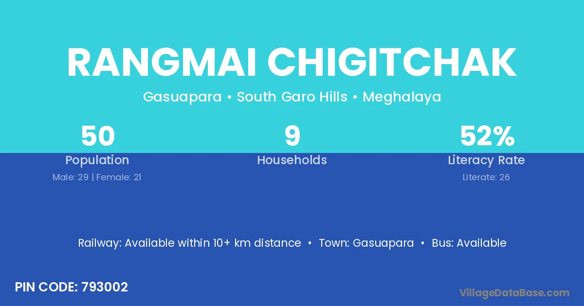 Rangmai Chigitchak village has a total population of 50 people, of which 29 are males and 21 are females.
