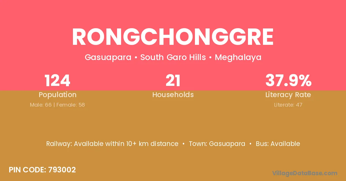 Rongchonggre village has a total population of 124 people, of which 66 are males and 58 are females.
