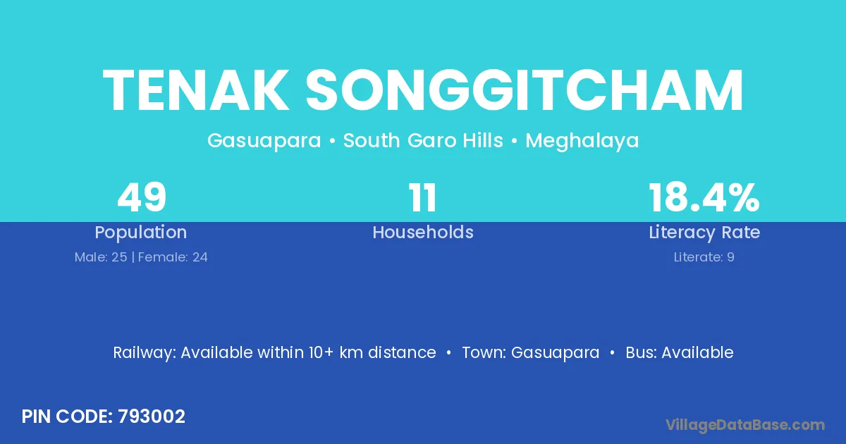 Tenak Songgitcham village has a total population of 49 people, of which 25 are males and 24 are females.