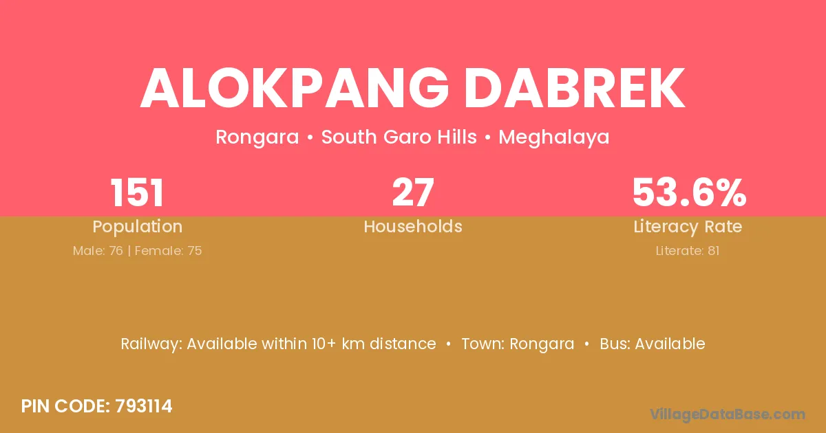 Alokpang Dabrek village has a total population of 151 people, of which 76 are males and 75 are females.