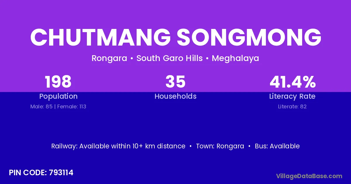 Chutmang Songmong village has a total population of 198 people, of which 85 are males and 113 are females.
