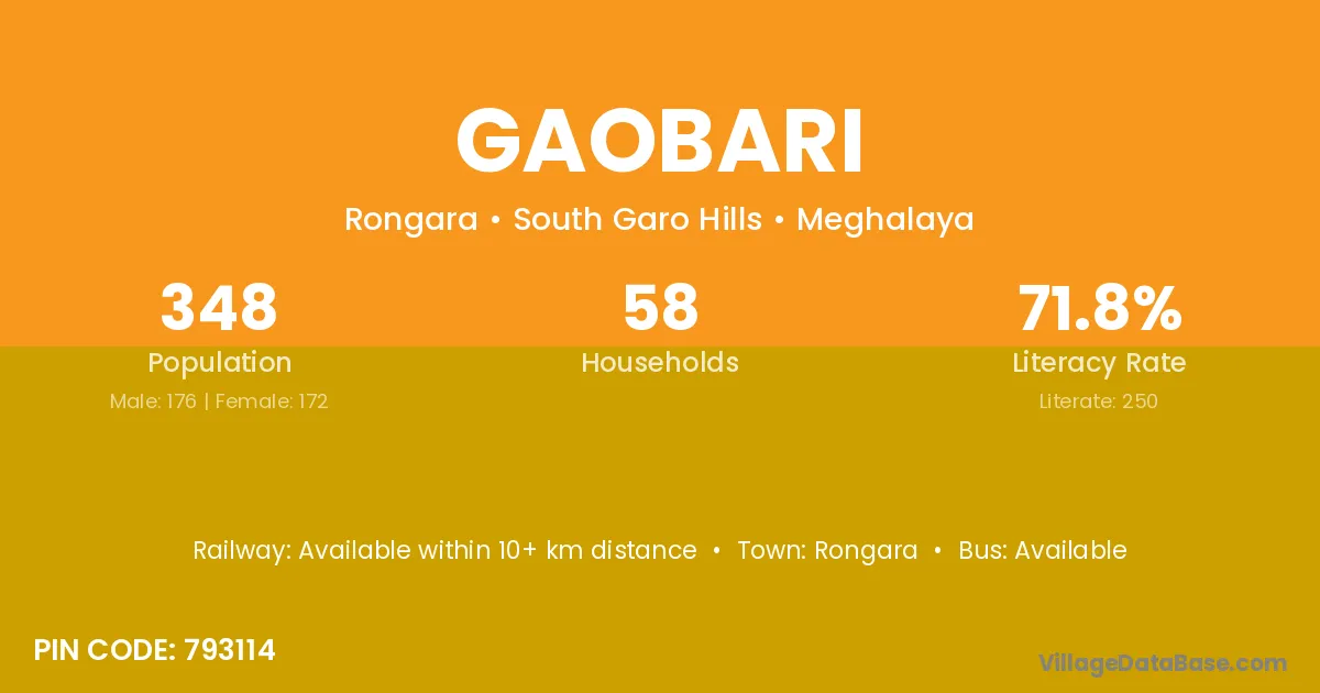 Gaobari village has a total population of 348 people, of which 176 are males and 172 are females.